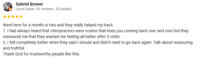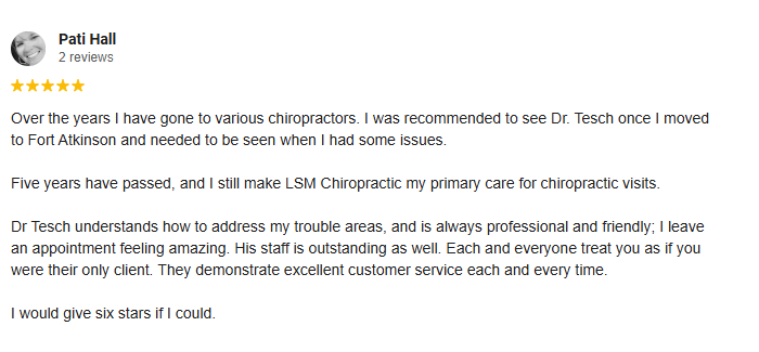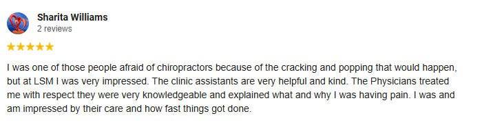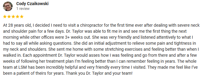 Testimonials Play Video Ben K's Testimonial Play Video Liesel O's Testimonial Play Video Michael K's Testimonial Play Video Jim F's Testimonial Play Video Kim J's Testimonial Play Video Kris H's Testimonial Play Video Cathy T's Testimonial Play Video Helen M's testimonial Play Video Donna S' Testimonial Play Video Michael S' Testimonial Play Video Adam's Testimonial LSM Chiropractic Click below to view our full list of locations. Locations